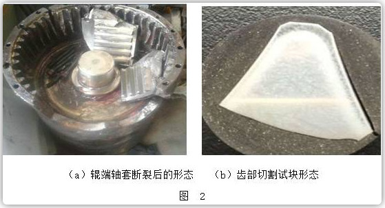 從圖1整套精軋機接軸中的裝配圖可以看出,輥端軸套右端內(nèi)齒與外齒軸套的外齒配合,另一端扁孔與軋輥配合,傳遞單向扭矩,軋鋼過程中,輥端軸套承受的沖擊力大。我公司為某鋼廠制作的1700mm精軋F1接軸上線使用8個月后,輥端軸套內(nèi)齒部位斷裂成四部分。此輥端軸套采用低碳合金鋼17Cr2Ni2Mo制造,整體滲碳處理,滲碳層深度2~2.5mm,齒部模數(shù)12,進行單齒感應(yīng)淬火后磨齒,磨量0.5mm,齒表面硬度要求58~62HRC。輥端軸套的主要制造工序為:熱鍛→正火+回火→粗加工→穩(wěn)定性回火→機加工(插齒)→滲碳→齒部單齒感應(yīng)淬火→磨齒(其余部位車、插加工)。