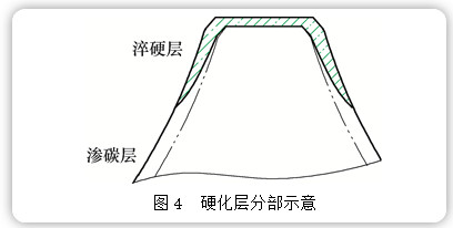 (2)齒部硬度檢測采用4%硝酸酒精腐蝕斷裂齒的截面,進行宏觀觀察及硬度檢測,整個齒的齒頂及齒側(cè)淬硬層分布如圖4所示,齒頂及齒側(cè)上部有淬硬層,齒側(cè)下半部分及接近齒根的位置無淬硬層。