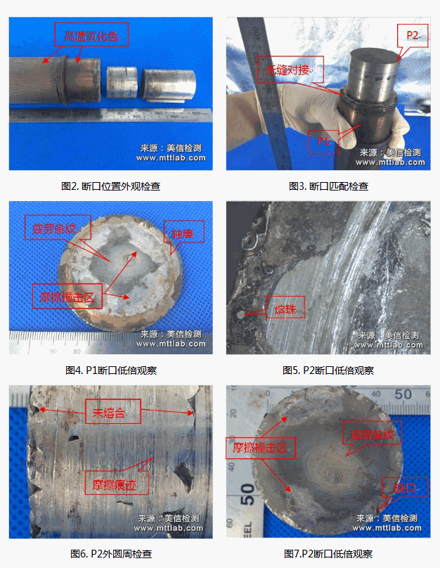 如圖2、圖3所示,斷口兩部分能無縫對接,無明顯塑性變形;P1靠近斷口部分表面呈高溫氧化色,大約占半根軸的長度,斷口位于大徑與小徑幾何尺寸突變臺階的R角。
