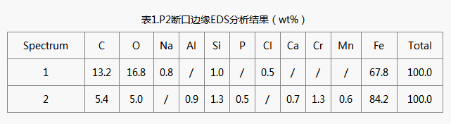 如圖14-圖19所示,P2斷口形貌與P1類似,外邊存在較多缺口,對缺口金相EDS微區(qū)成分分析,結(jié)果見表1,外邊緣成分與心部成分存在差異(外邊緣不含Cr、Mn),確認(rèn)外邊緣不同形貌位置為補(bǔ)焊層。