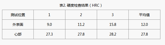 按GB/T230.1-2009標(biāo)準(zhǔn)方法檢驗(yàn)失效件橫截面心部和外表面硬度,結(jié)果記入表2。