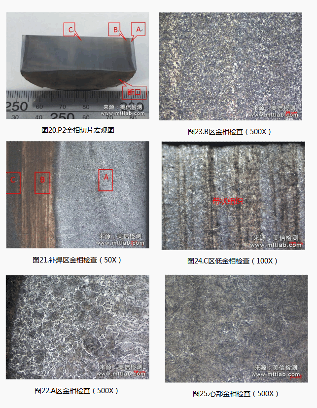 如圖20-圖25所示,沿P1軸向做切片,拋光腐蝕后發(fā)現(xiàn)軸表面與心部組織具有不同組織,界限明顯,確定軸承裝配位置存在補(bǔ)焊操作,斷口位于補(bǔ)焊邊緣的熱影響區(qū),將圖中不同組織區(qū)域依次標(biāo)記為A、B、C:A為補(bǔ)焊熔融區(qū),B為軸熱影響區(qū),C為軸基材,金相組織依次:A區(qū)為網(wǎng)狀、粗針狀鐵素體+粒狀和針狀馬氏體+針片狀魏氏體,按GB/T1329-1991評定魏氏體組織為B系列5級;B區(qū)為少量粒狀體鐵素體基體珠光體;C區(qū)為少量針狀魏氏體+保留馬氏體位向的針狀索氏體,心部帶狀組織明顯,按GB/T1329-1991評定帶狀組織級別為C系列5級。